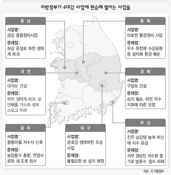안동 구담보, 습지 훼손 아랑곳없이 밀어붙여 금강선 550억 들여 수상레저용 대덕보 추진 4대강 사업 강행을 둘러싼 논란이 커지는 가운데 경북과 대전 등 지방정부들이 4대강 사업에 편승해 보를 추가로 건설하겠다고 나서 즉흥적 예산낭비 사업이라는 비판을 받고 있다.