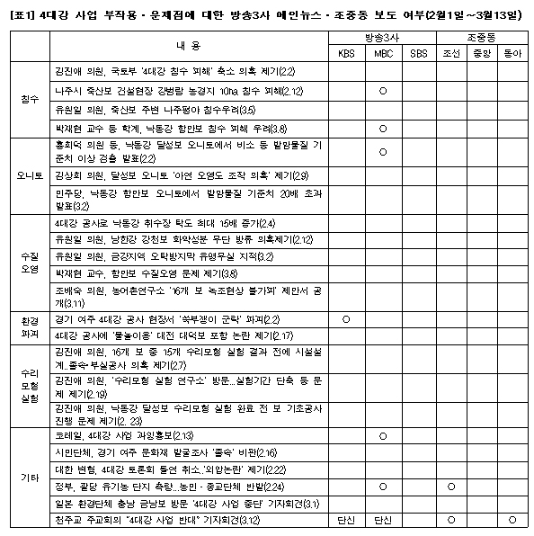 '4대강 부작용'에 입 다문 KBS·SBS·조중동오마이뉴스 | 입력 2010.03.17 21:33 [오마이뉴스 민주언론시민연합 기자] 정부가 강행하고 있는 4대강 사업의 부작용이 속속 드러나고 있다. 지난 2월 4대강 공사 중 강바닥에서 긁어낸 오니토로 인한 수질오염 문제가 제기됐다. 야당 의원들이 낙동강 달성보 오니토에서 비소 등 발암물질이 기준치 이상 검토됐다는 시료 채취 결과를 발표한 것이다. 이후 함안보 지역의 오니토 오염 사실이 추가로 드러났다. 또 남한강 강천보 공사현장에서 암반 발파작업을 한 뒤 '화약성분'을 강으로 무단 방류해 수질을 오염시켰다는 주장도 나왔다. 침수피해도 우려되고 있다. 야당에서는 국토부가 침수피해를 축소했다는 의혹을 제기했으며, 함안보 건설 지역의 경우 학계와 시민단체의 침수피해 우려가 잇따르자 강 수위를 7.5m에서 5m로 낮추기도 했다. 하지만 학계에서는 함안보 건설에 따른 침수피해가 4.1㎢에 이를 것이라고 우려하고 있다. 영산강 죽산보 수위가 농지보다 1m 높아 나주평야의 침수가 우려된다는 주장도 나왔다. 실제로 침수피해가 발생한 지역도 있었다. 지난 2월 12일 4대강 공사가 진행 중인 나주 죽산보 건설현장에서 강이 범람해 농경지 10ha가 침수되는 피해가 발생했다. 수리모형 실험이 졸속·부실이라는 문제제기도 나왔다. 야당과 시민단체는 6개월 동안 진행되어야 할 수리모형 실험을 1~2개월로 단축해 졸속으로 진행되고 있다고 비판했다. 또 낙동강 달성보의 경우 수리모형 실험이 끝나지도 않았는데 벌써 보 기초공사를 진행한 사실이 드러나는 등 보 부실공사 우려가 제기되고 있다. 이외에도 4대강 공사로 경기 여주의 세계 유일의 희귀식물 담양 쑥부쟁이 군락지가 파괴되고, 경기도 팔당 유기농단지가 없어질 위기에 처하는 등 부작용이 심각하다. 그러나 조중동과 방송3사, 특히 KBS와 SBS의 메인뉴스는 4대강 사업의 부작용과 문제점을 거의 보도하지 않고 있다. 또 천주교 주교회의가 총회를 통해 "4대강 사업 반대"를 공식 표명하고, 대한변협이 돌연 4대강 토론회를 취소해 '외압논란'이 제기됐지만 이런 사실도 제대로 보도되지 않았다. ([표]참조)